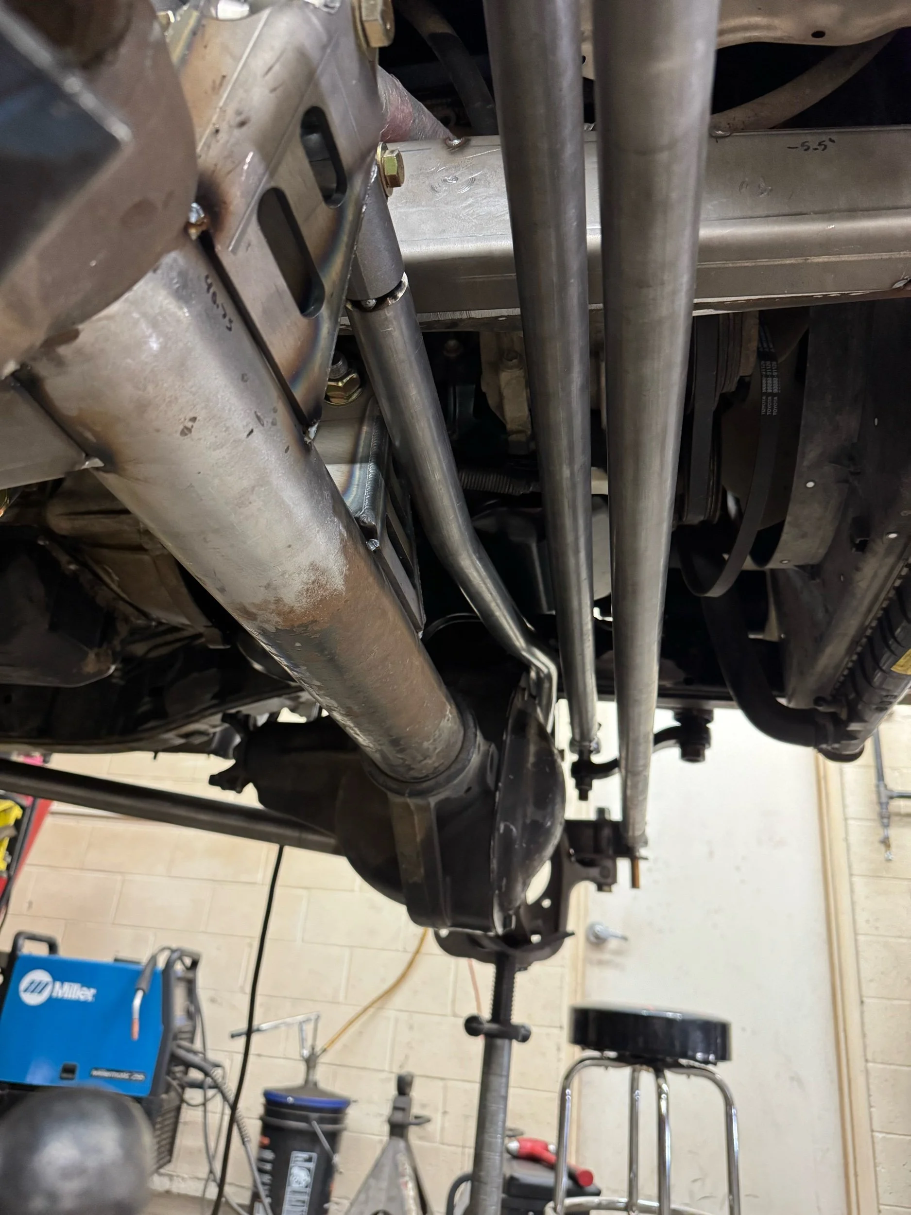 The transmission crossmember replaces your factory crossmember and has the lower link mounts incorporated in it. It is constructed from 3/16” and 1/4” mild steel. Its 3 piece design still allows easy removal of your transmission.